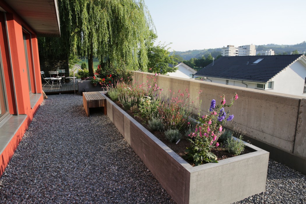 Terrassen- oder Balkongärten müssen spezifischen Anforderungen genügen. Wir berücksichtigen bei der Planung und Umsetzung unter anderem folgende Aspekte: